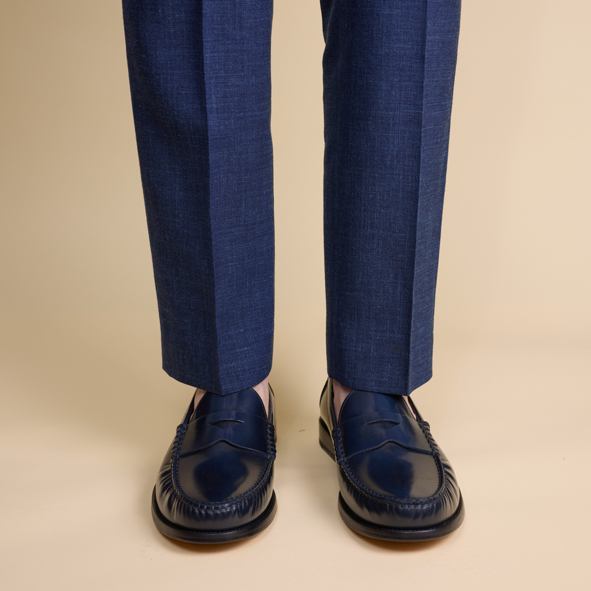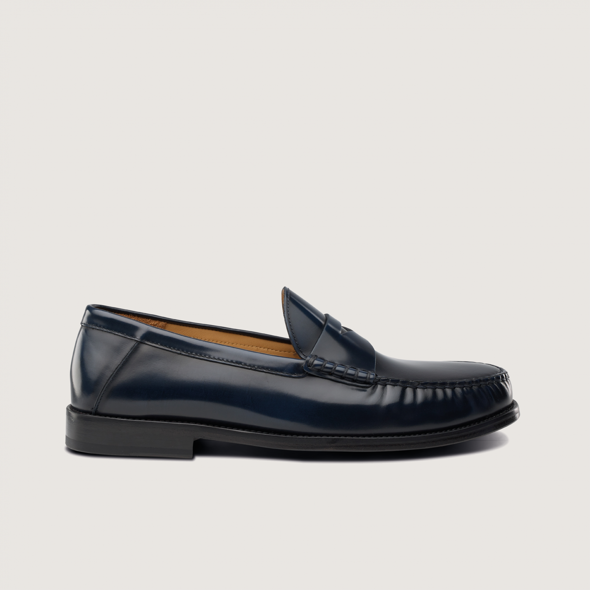 Mocassin Mae, Cuir abrasif bleu, Montage cousu mocassin, Semelle cuir & patin gomme.