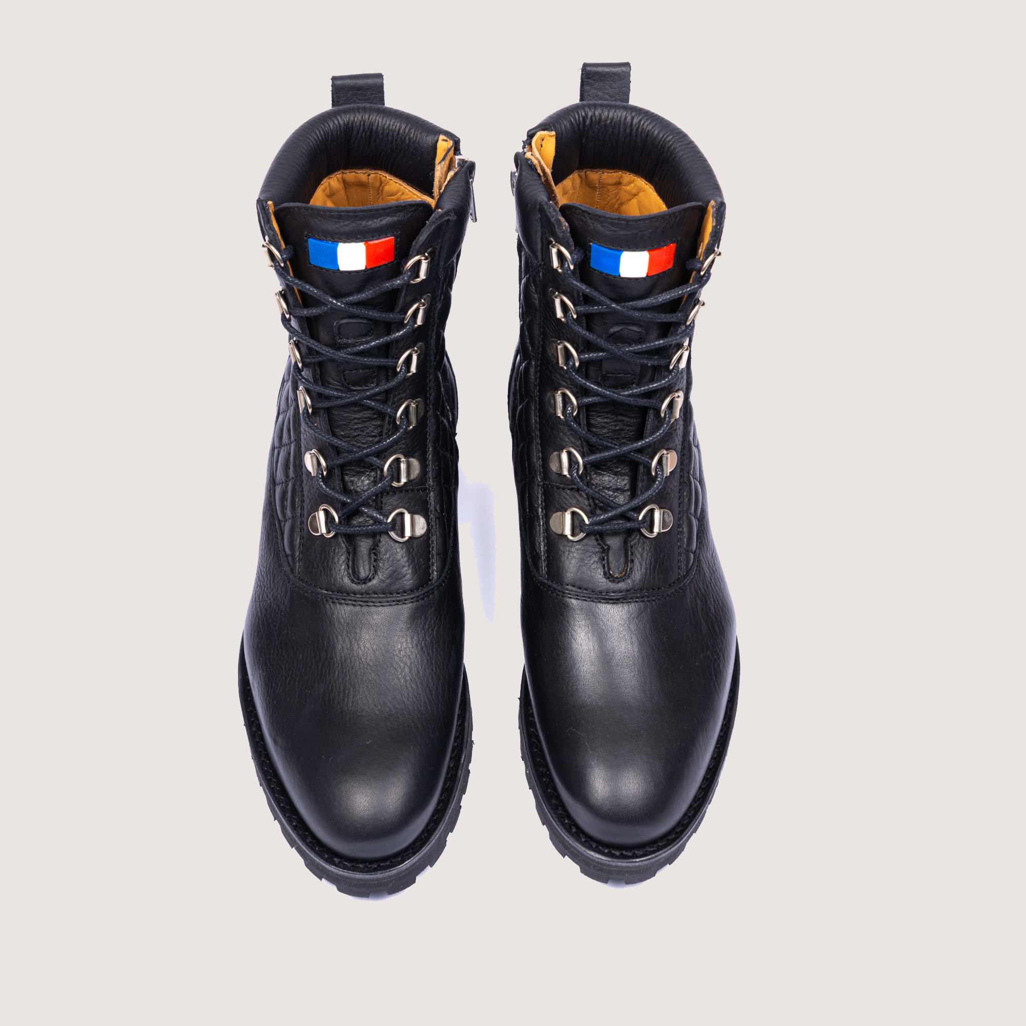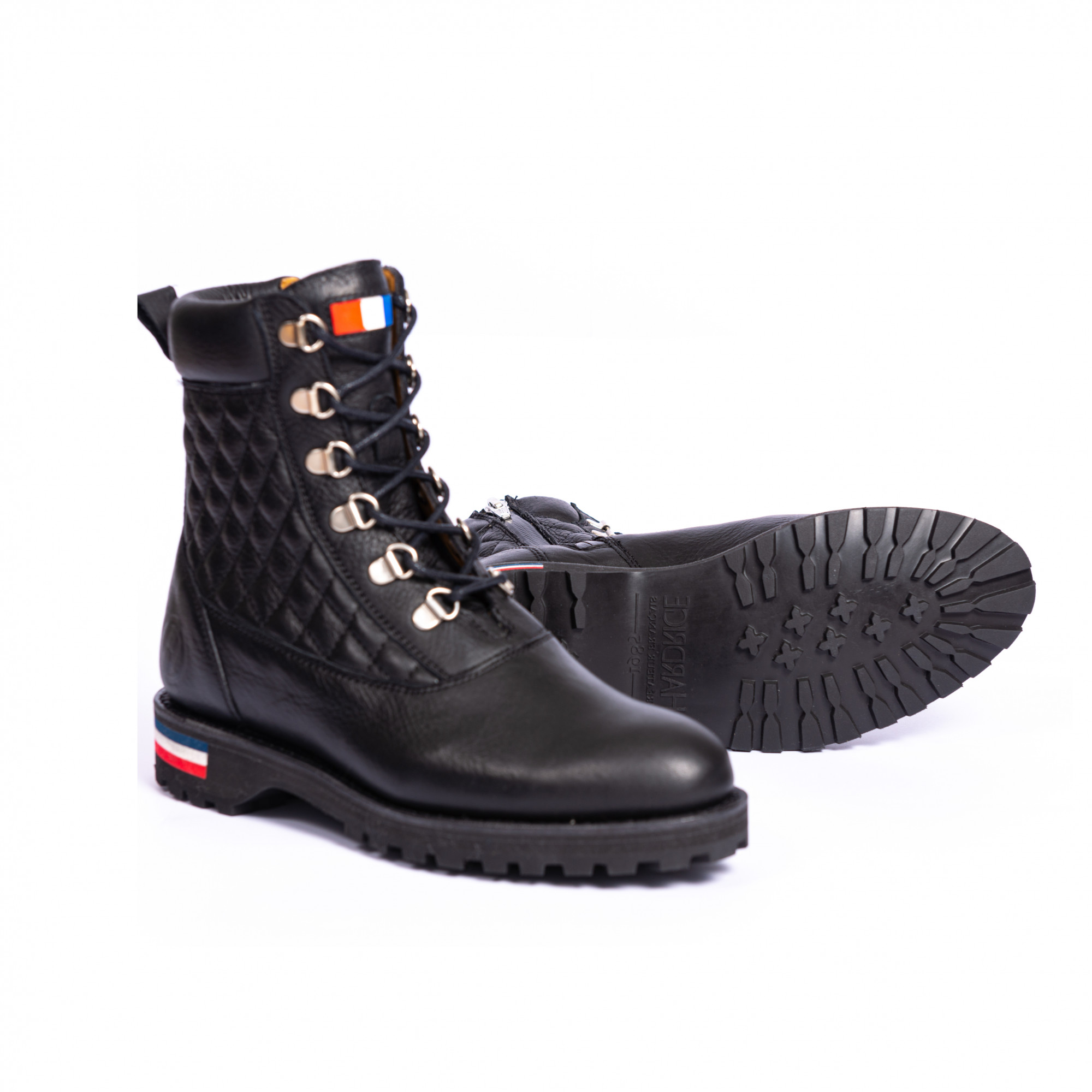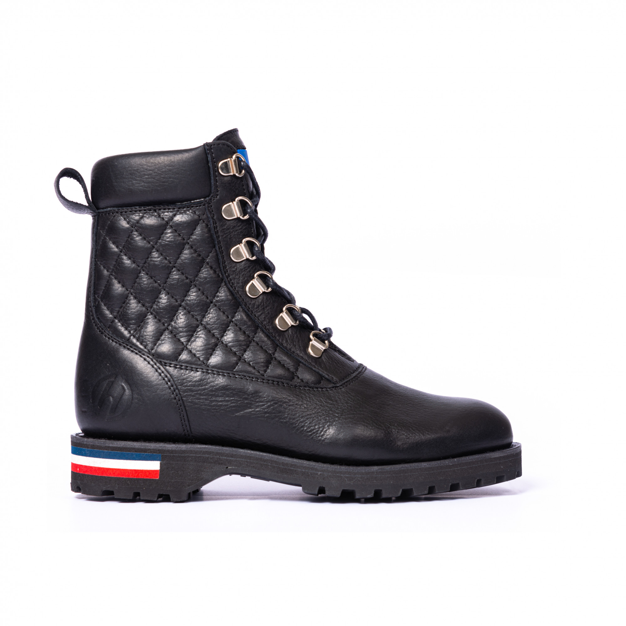 Cette boots est directement inspirée des brodequins de montagne. Plus qu'une simple chaussure, la mountain boots Vercors est un concentré de notre histoire et de notre savoir-faire. Une boots pour femme en cuir matelassé pour laquelle nous avons fait le choix d'utiliser des passe lacets. Tout a été pensé pour le confort de marche en toutes circonstances : Vercors est dotée de soufflets d’étanchéité de chaque côté de la languette matelassée et d'une semelle compensée noire avec inserts bleu blanc rouge.