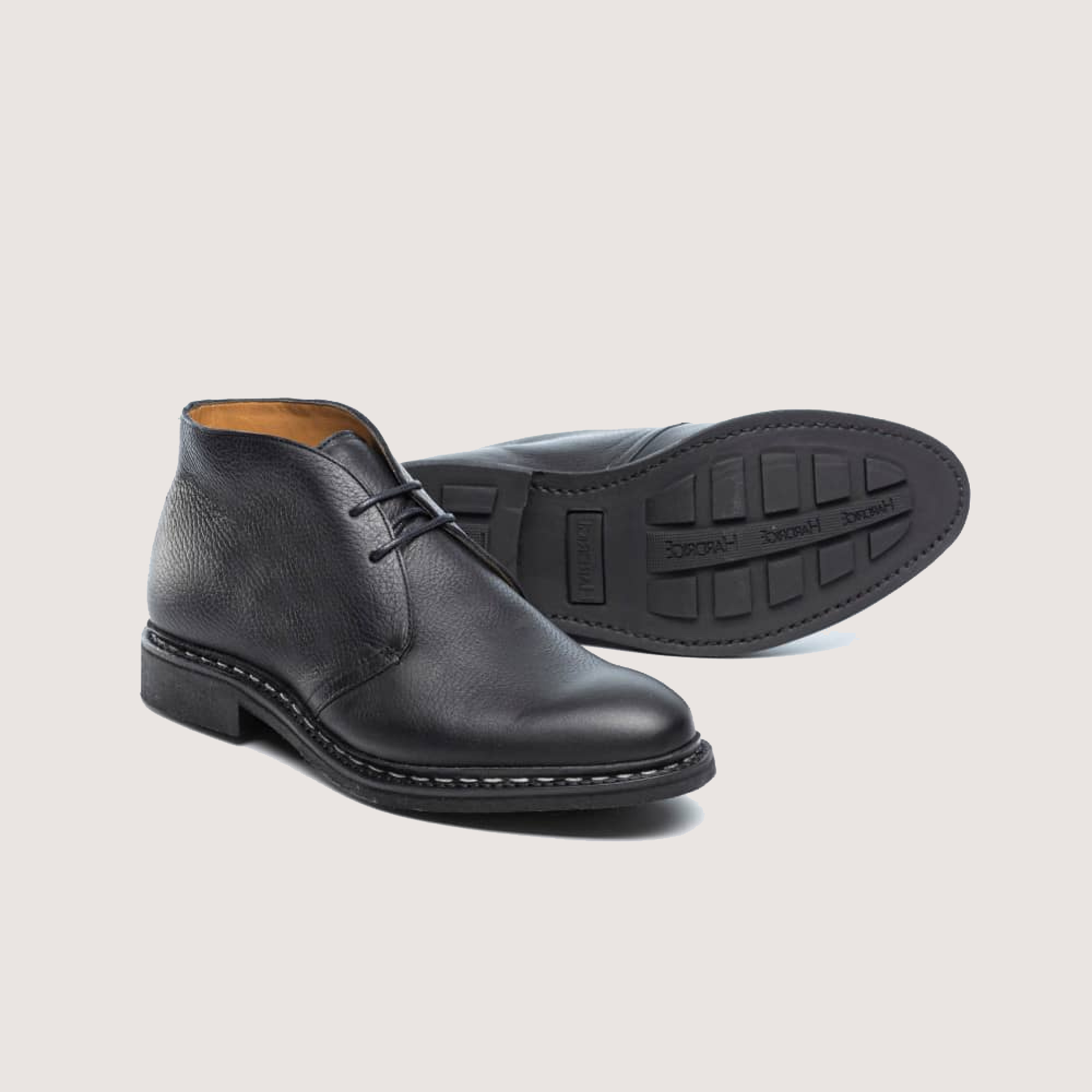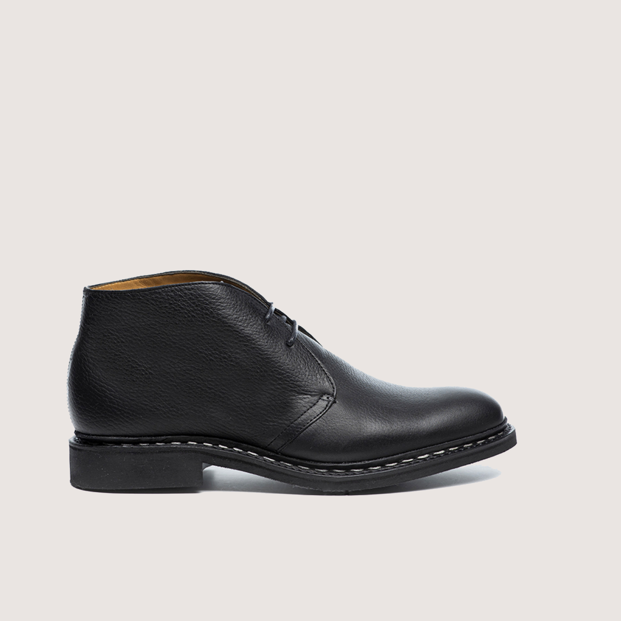 Desert Boot en cuir "hidro" noir pour homme. Semelle gomme. Montage cousu Norvégien.