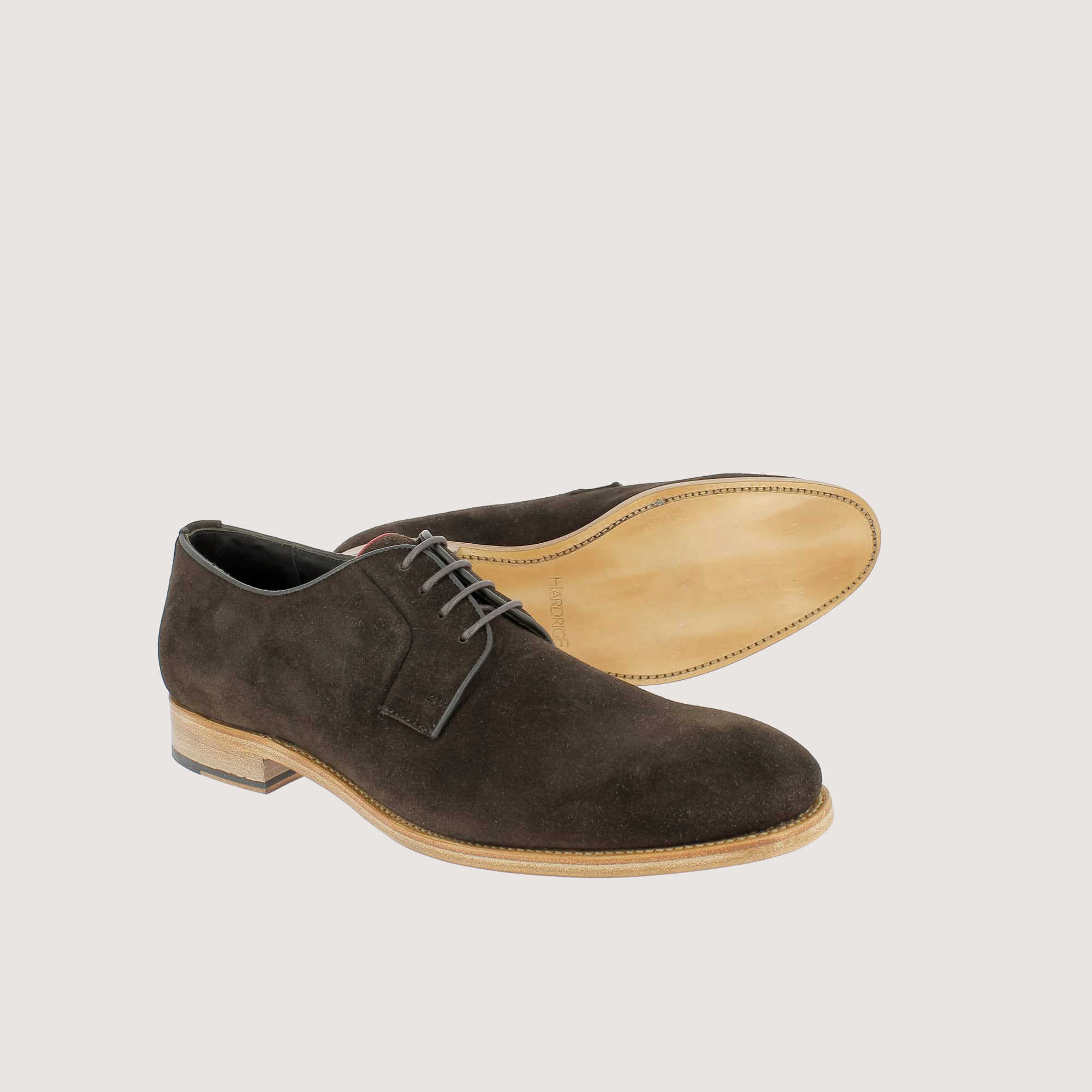 Derby pour homme en cuir Velours Marron et semelle Cuir. Montage Cousu Goodyear. Liseré rouge sur la languette