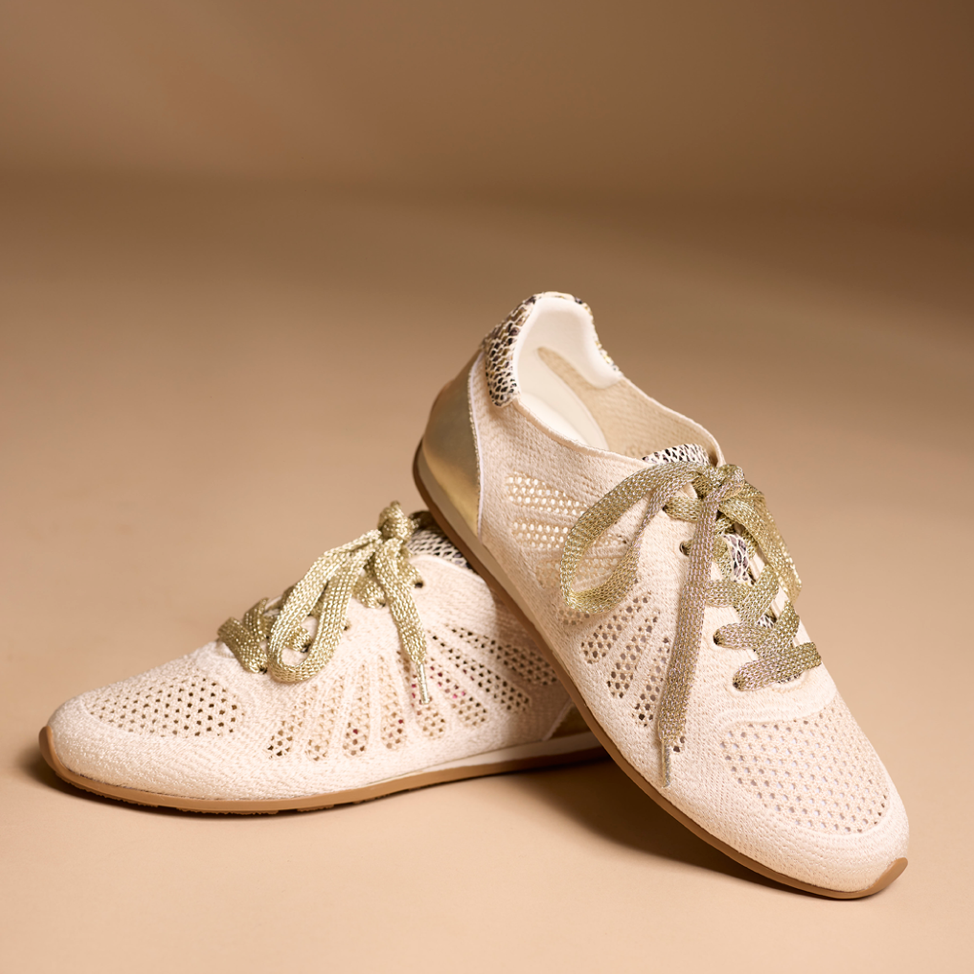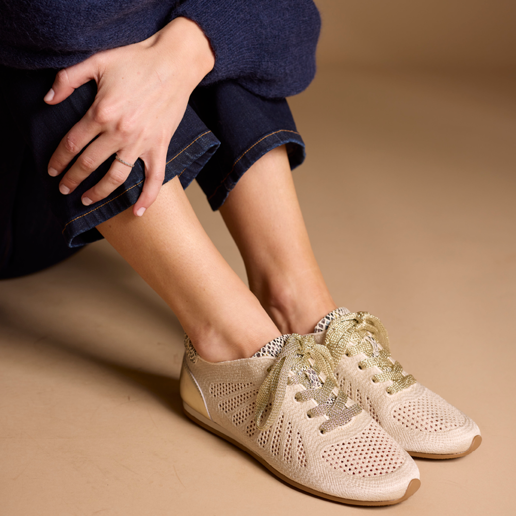 Basket ajourée femme en toile beige, semelle intérieure cuir, semelle extérieure bi-colore beige et blanc en gomme. Empiècement en cuir beige à l'arrière.