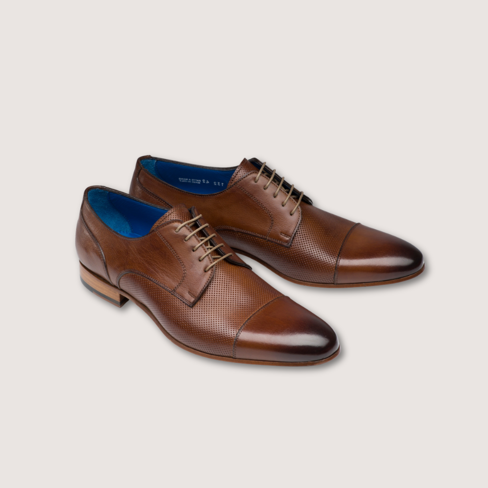 Derby pour homme avec empeigne perforée, cuir patiné gold, semelle cuir. Montage cousu Blake