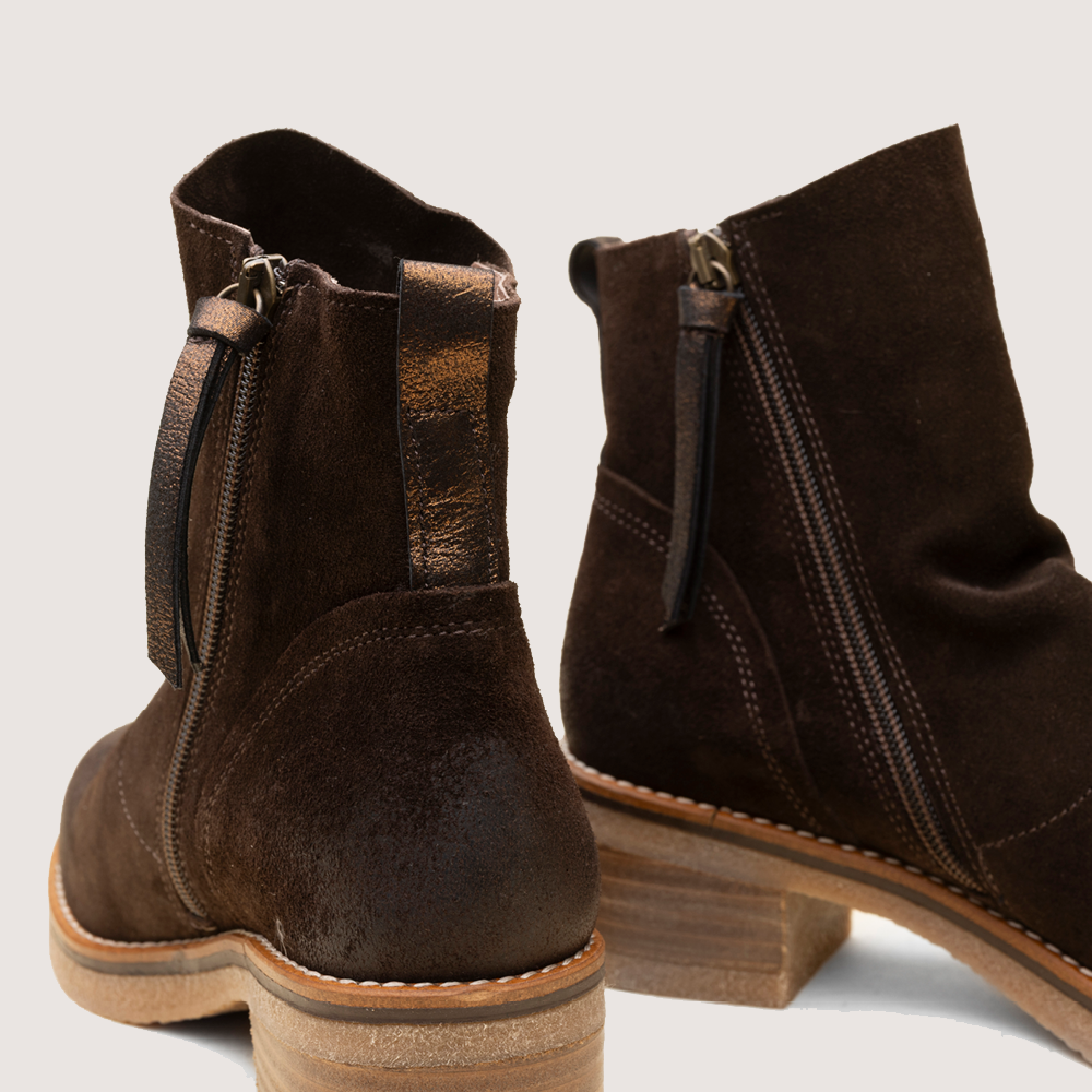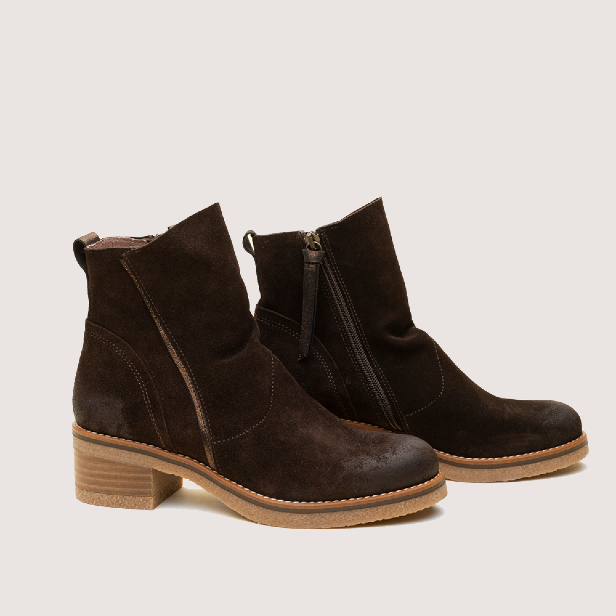 Boots femme en cuir noir. Semelle crêpe. Talon Effet bois. Tige souple. Fermeture éclaire sur le côté. Hauteur Tige : 12 cm. Talon : 5 cm.