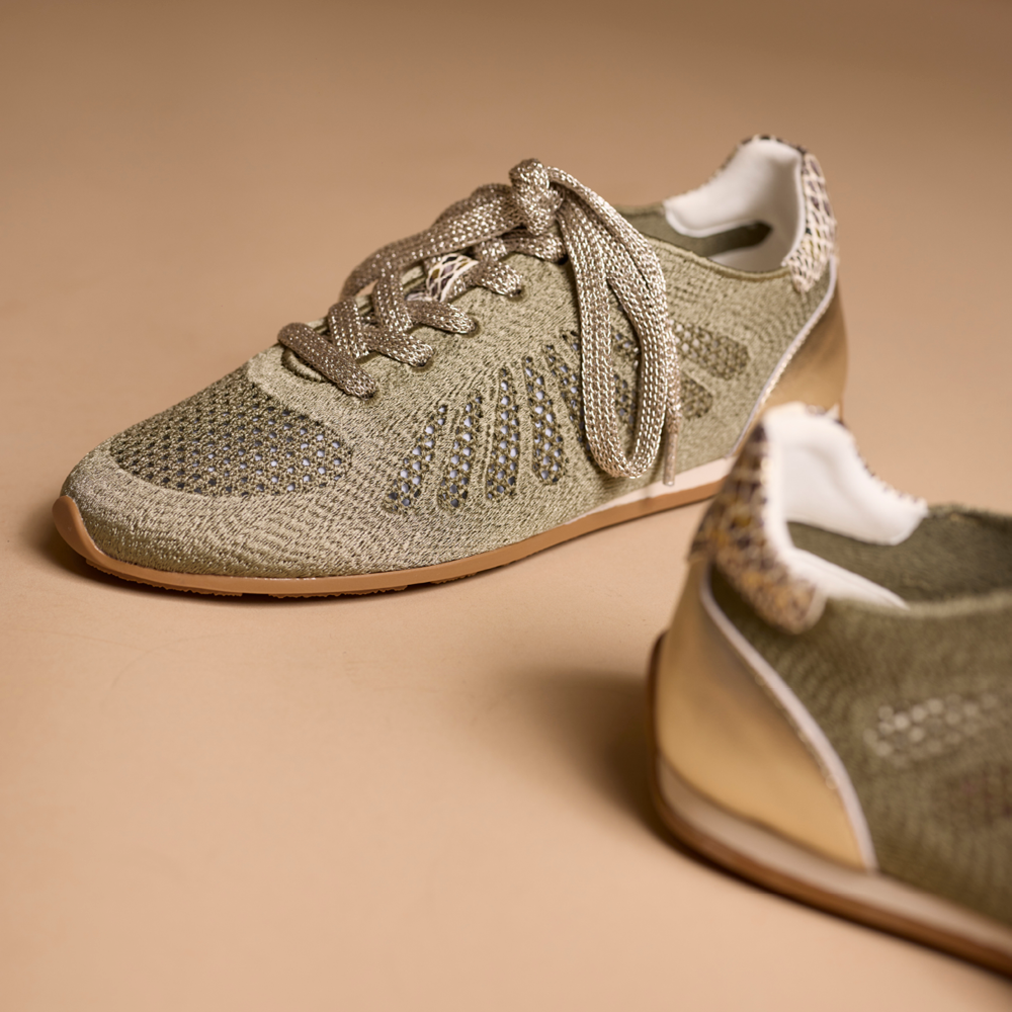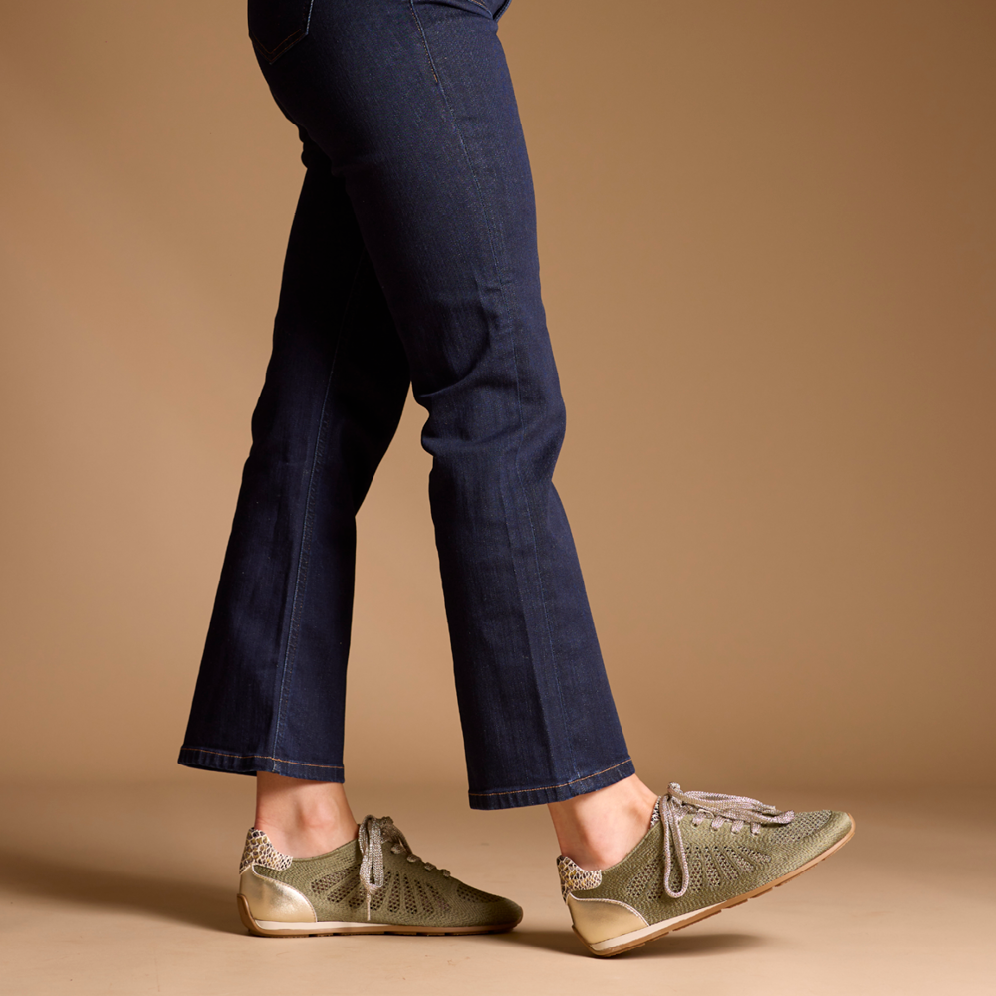 Basket ajourée femme en toile kaki, semelle intérieure cuir, semelle extérieure bi-colore beige et blanc en gomme. Empiècement en cuir beige à l'arrière.